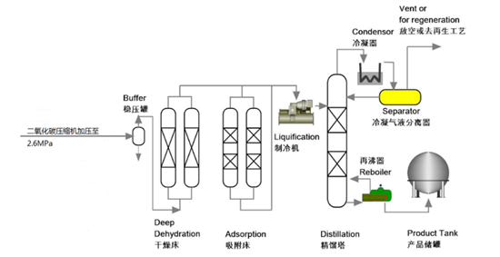 電子級二氧化碳以食品級二氧化碳為原料,采用深冷精餾+物理化學(xué)吸附的工藝生產(chǎn)。食品級二氧化碳純度一般在99.9%以上,雜質(zhì)較少,CO、H2含量較低,利用純化新工藝,能有效的除去產(chǎn)品中相關(guān)的雜質(zhì),生產(chǎn)過程中原料損耗低、純化新工藝中的能量平衡并回收利用,電耗等較低,流程相對簡單可靠,產(chǎn)品收率高,投資省。